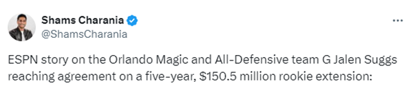 今夏魔术与2021年首轮8号秀小瓦格纳续签5年2.24亿美元的续约合同,魔术与萨格斯续签5年1.505亿美元合同,这有利于球队未来与班凯罗续签顶薪合同。