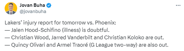 湖人官方已经公布对阵太阳的伤情报告——席菲诺(生病)大概率不会出战(出战概率25%)、科洛科(身体状态恢复)、范德比尔特(右脚伤势恢复)、克里斯蒂安-伍德(右膝术后恢复)继续缺席比赛。同时双向合同球员奥利瓦里和特拉奥雷被下放到南湾湖人,也将缺席比赛。