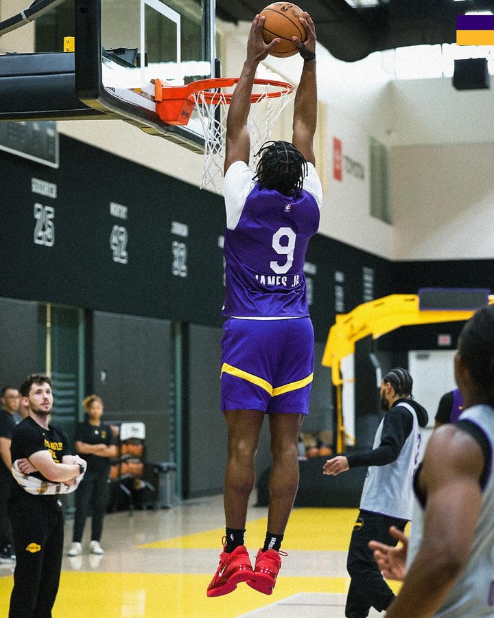 今日湖人全队在训练馆中积极备战下一场与太阳的比赛,詹姆斯在镜头中咧嘴大笑十分开心,还与里夫斯击掌庆祝;浓眉的表情比较严肃,布朗尼训练期间双手扣篮;雷迪克指挥讲话时,布朗尼的表情十分抢镜。
