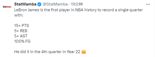 1、詹姆斯是联盟历史上首位单节以100%命中率砍下15+5+5的球员