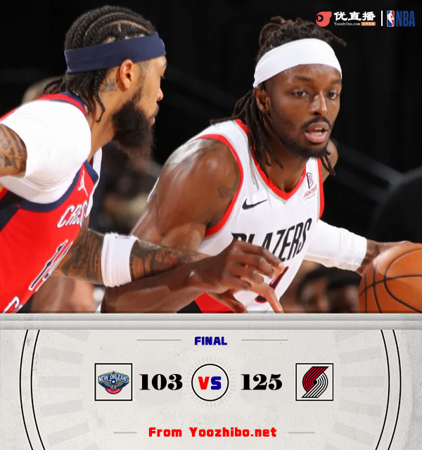 NBA常规赛,开拓者主场迎战鹈鹕,目前开拓者0胜2负,鹈鹕则是2胜0负,前天两队刚交手一场,开拓者被鹈鹕逆转。比赛开始,莺歌联手麦科勒姆反客为主先打出8-0开局,随后开拓者接连外线三分追平比分,艾顿里补外投带队回应10-0建立主动权,霍金斯连得6分止血,首节鹈鹕仅落后1分,次节克林根成为奇兵,攻防两端连续立功,加上外线三分,开拓者一波小高潮重新领先到双位数,半场开拓者领先12分。下半场,开拓者接连抢到前场篮板拿到二次进攻机会,一波9-0直接拉开20分以上领先,鹈鹕三分回暖追分,三节开拓者依然领先16分,末节格兰特接连突破2+1连砍8分带队重新拉开20分以上领先,随后鹈鹕多次追分未果,最终开拓者125-103大胜鹈鹕,拿到首胜。