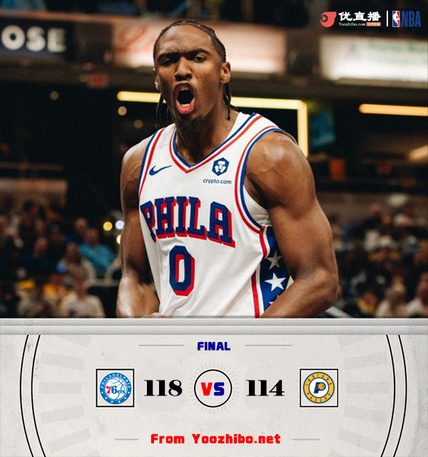 NBA常规赛,步行者主场迎战76人。步行者开局1胜1负,76人遭遇2连败。恩比德和乔治继续缺阵。一开场,双方对飙三分,76人持续发力取得微弱领先,次节步行者展开反击,多点开花反超比分,洛瑞三分止血,半场战罢步行者58-52领先76人。下半场,步行者命中率下降,76人频频冲击篮筐连投带罚拿分重夺领先,末节双方争夺陷入白热化,比分始终紧咬,76人挑战球权归属反被吹犯规,但步行者连续失误,76人趁势反超,哈利伯顿关键三分将比赛拖入加时。加时赛,双方依旧打得难解难分,马克西内外开花,步行者连投带罚还以颜色,又到关键时刻马克西挑篮拿分后送出封盖,76人祭出点球战术,最终以118-114力克步行者。