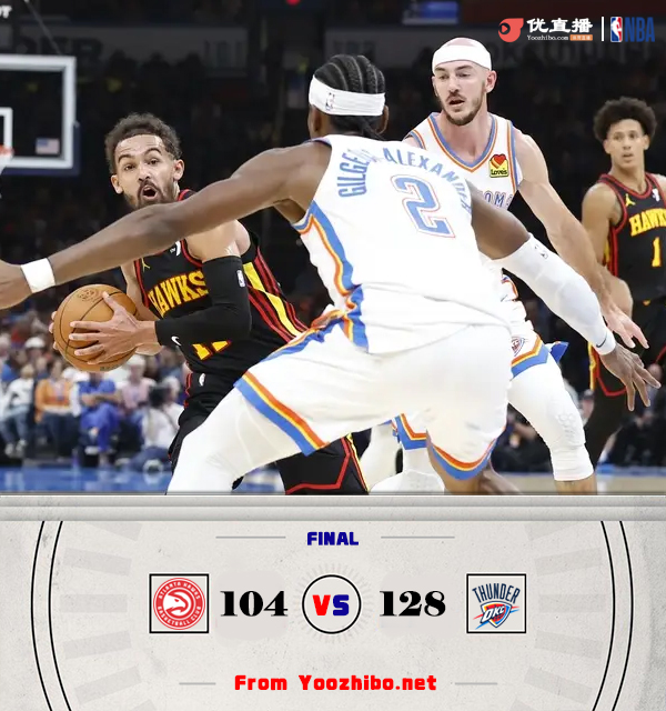 NBA常规赛,老鹰对阵雷霆,两支球队新赛季开始都是取得2连胜。开场后老鹰外线手感不错连中三分,雷霆也是多点开花连连得手,场上比分也是十分胶着,里萨谢篮下表现活跃连续打进,老鹰首节保持微弱优势。第二节上来亚历山大接连砍分,老鹰外线保持不错及时回应,特雷-杨也开启得分模式帮老鹰将分差一度拉大到10分,半场结束前霍姆格伦和杰伦-威廉姆斯联手帮雷霆将分差追到只差1分。易边再战,亚历山大和霍姆格伦联手帮助雷霆完成反超,老鹰依旧是靠着三分紧追不舍。最后一节老鹰命中率下降,雷霆则是在“新三少”的带领下将分差拉大到20分,比赛失去悬念,最终雷霆128-104击败老鹰取得3连胜,老鹰遭遇赛季首败。