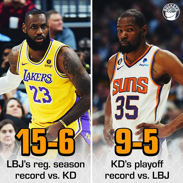 生涯至今,两人的交手战绩是——常规赛詹姆斯15胜6负占优,季后赛杜兰特9胜5负占优;在此前的季前赛,詹姆斯和杜兰特曾对决过,两人第二节疯狂对飚,詹姆斯单节12分,杜兰特则是单节16分。