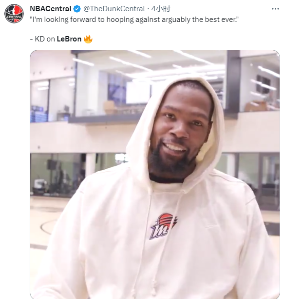 谈到对阵詹姆斯,杜兰特表示:等待太久了,太久没打了。期待与历史最佳的交手,这总是一项有趣的挑战,等不及看到这一幕了。