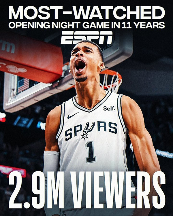据NBA官方统计,马刺和独行侠一战的收视率达到了299万,是ESPN转播独行侠以及马刺收视率最高的常规赛比赛(圣诞大战除外);法国NBA League Pass的收视率比上赛季常规赛平均收视率增长了220%。