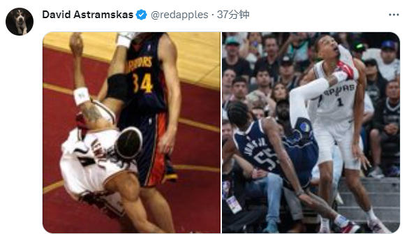 美球迷晒出NBA“上腿踢人”名场面——纽贝尔飞踢迈克-邓利维的下巴,卡尔-马龙飞踹“石佛”邓肯的面部;如今马刺新科状元文班亚马也遭遇同样的伤害,球迷调侃文班一步一步地走邓肯的路。