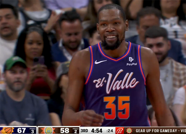 下半场,不知何故杜兰特迟到了将近2分钟,奥尼尔顶替他首发,第三节10分02秒杜兰特回到场上,KD回来后延续火热手感,单节6中6独砍15分,死神挥舞镰刀,反击空接劈扣后咧嘴笑,小帅又打开心了;不过杜兰特下场后太阳集体哑火,被马刺8-0反超1分。