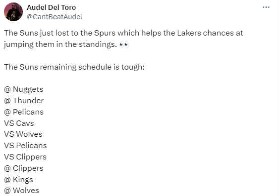 输球后太阳排名跌出西部前六,战绩变成42胜30负,据统计,太阳队的剩余赛程是全联盟最难的,最后10场将对阵掘金、雷霆、鹈鹕、骑士、森林狼、鹈鹕、快船、国王和森林狼,他们的胜率合计为64.8%;种种情况来看,恐怕太阳要通过附加赛的激烈厮杀,才有机会杀进季后赛。
