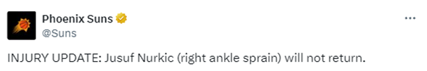 太阳耻辱还遭伤病打击——努尔基奇不幸扭伤脚踝,因伤提前退出比赛,今日仅出战19分钟,9投3中拿到6分9篮板4助攻2盖帽;比尔疑似戳伤手指,也提前伤退,出战30分钟,11投4中拿到9分5篮板6助攻2抢断;赛后太阳记者表示比尔的右手无名指扭伤,X光检查呈阴性。