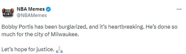 波蒂斯更新社交媒体,发推写道:我把密尔沃基视为我的家。昨晚,我在比赛的时候,我家被盗了,我的许多珍贵物品被偷走。如果您有任何线索或信息,请发送至我的邮箱,提供线索帮助追回或逮捕罪犯的,我将给予奖励。