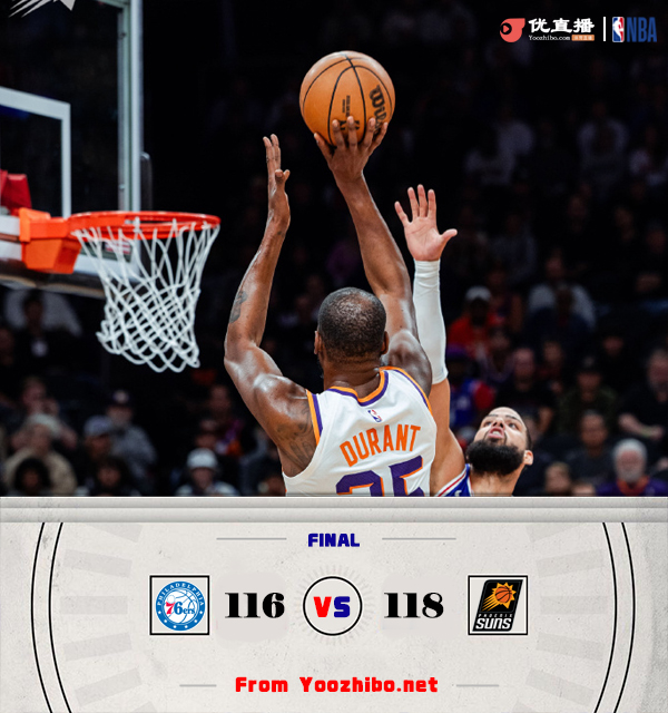 NBA常规赛,太阳今日迎战76人,前者近来状态不错取得四连胜,后者则是遭遇两连败,此役乔治复出迎来首秀。比赛上来,太阳率先发力利用一波8-0的小高潮将分差拉开到了两位数,不过之后他们的命中率有所下滑,76人在洛瑞的带领下逐渐追了回来,次节双方开始展开对攻,单节打出37-37的高比分,半场结束时太阳仅领先2分;下半场回来,两队依旧是打得难解难分,分差一直没能再拉开,在末节104-104平后76人连中三记三分球获得场上主动权,不过太阳没有放弃回敬8-0咬住比分,关键时刻杜兰特上篮反超,马克西绝杀三分不中,最终太阳险胜76人迎来五连胜。