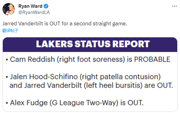 来源:24直播网10-26 16:1024直播网10月26日,湖人官方公布下一场对阵太阳的伤病报告,雷迪什(右脚酸痛)大概率出战,范德比尔特(左脚后跟酸痛)和席菲诺(右髌骨挫伤)因伤继续休战,福奇前往G联赛也缺席比赛;詹眉带队冲击赛季首胜,太阳三巨头有望首次合体。