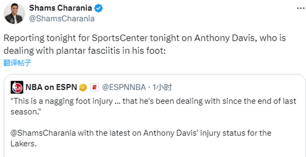shams还透露,浓眉正在处理脚部足底筋膜炎,这是浓眉脚部痛疼的原因。