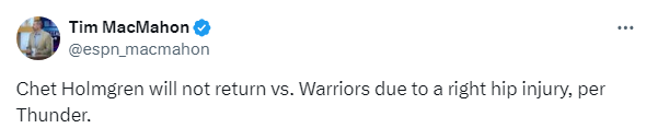 离场前,霍姆格伦首发出战5分10秒,3投0中、三分2中0没有得分和助攻进账,贡献4个篮板,正负值+4;根据雷霆官方消息,霍姆格伦的伤情初步确诊为右髋部受伤,本场比赛不会回归。
