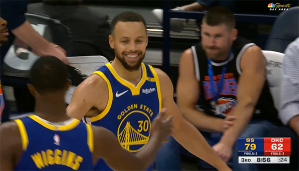 库明加空接扣篮为勇士打破得分荒,库里迎着防守命中三分,1分12秒库里更是命中制胜三分,雷霆撤下主力提前认输,最终勇士拒绝逆转。