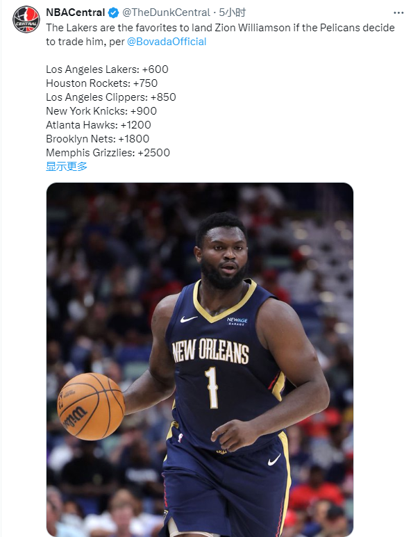 另外美媒报道,若锡安被交易,他的下家赔率中湖人最被看好,火箭第二,锡安下家赔率情况——1、湖人+600;2、火箭+750;3、快船+850;4、尼克斯+900;5、老鹰+1200;6、篮网+1800;7、灰熊+2500;8、公牛+2800。