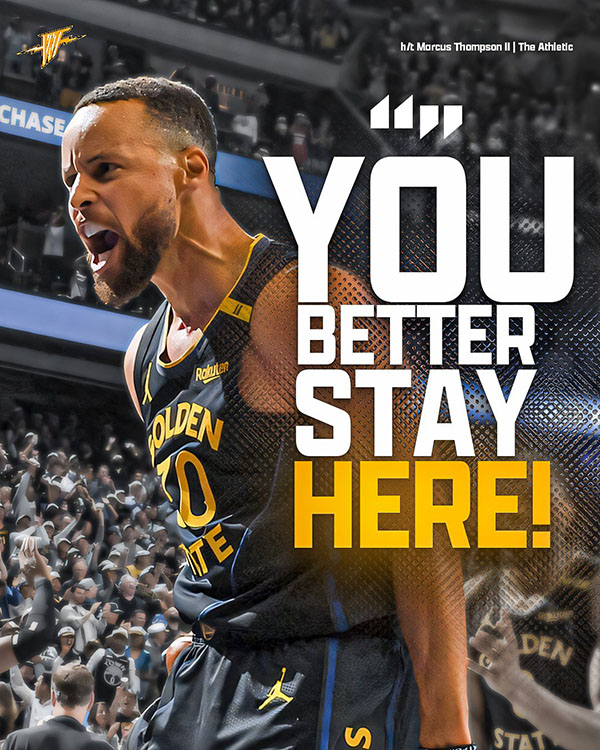 在克莱回家之夜,库里不仅关键时刻连得12分,而且命中制胜三分,冲着镜头激情怒吼庆祝,据报道,库里连续怒喊:你最好留在这里;赛后库里更是告诉追梦:就给我留在这儿;追梦回复:好的,一直都在。
