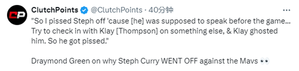 来源:24直播网11-14 16:0624直播网讯勇士主场击败独行侠,库里末节关键时刻连得12分接管比赛,亲手搞砸克莱的回家之夜;北京时间11月14日,追梦格林在节目中爆料,库里因克莱的冷漠而生气,我还在中间拱火。