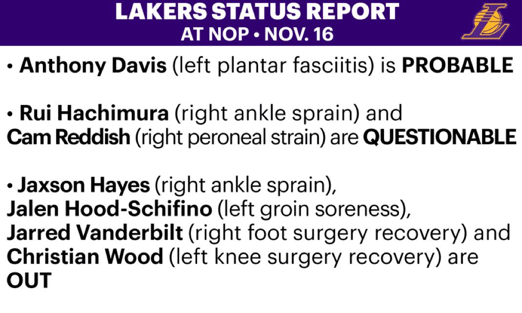 鹈鹕官方表示,本场比赛总共有8名球员缺阵,有10名球员可以出战湖人。