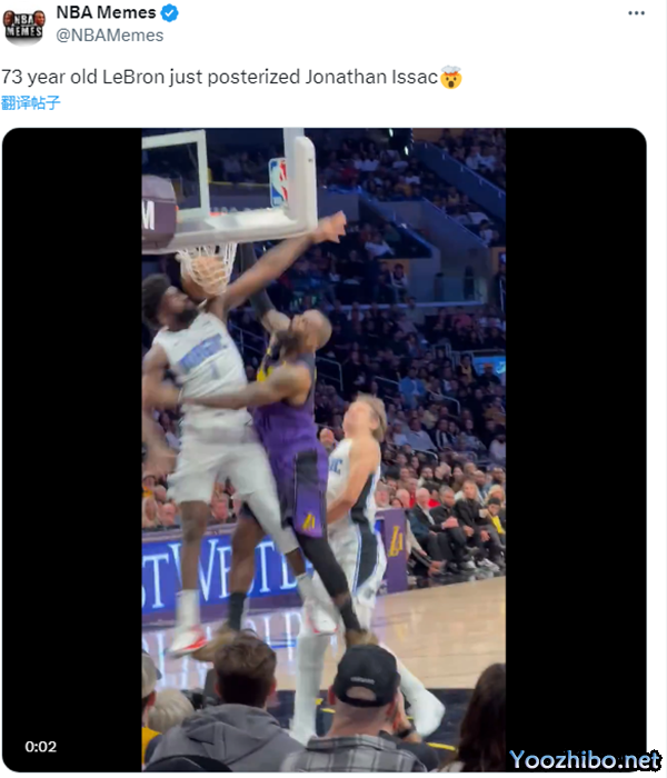 第二节39岁的詹姆斯霸气隔扣宣泄情绪——大瓦格纳隔扣克里斯蒂之后,詹姆斯外线持球过掉大瓦格纳,杀到禁区直接隔扣艾萨克,霸气隔扣后詹姆斯站在原地怒瞪对手,湖人主场彻底沸腾了,无数球迷起立欢呼甚至双手抱头。