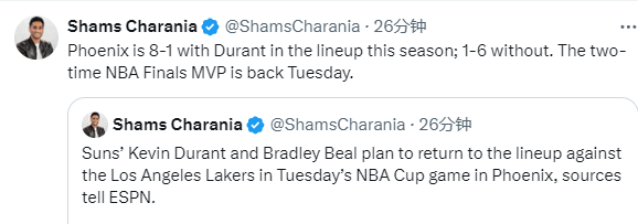 据名记Shams报道,消息人士透露,杜兰特和比尔将在明天对阵湖人的NBA杯比赛中回归,本赛季杜兰特上场时,太阳8胜1负,杜兰特伤停时太阳1胜6负,这位两届FMVP将在明天复出