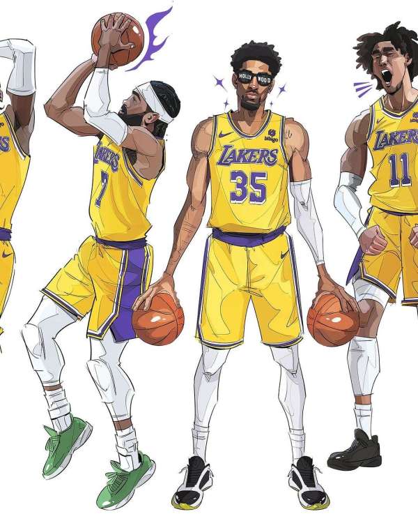 在湖人全队漫画版合影中,17名球员都在其中,詹姆斯和浓眉两大巨头位居C位凸显球队的地位,老詹身穿23号并且做出戴王冠的庆祝动作;浓眉戴着发带怒吼,八村垒身背日本武士刀十分抢镜。
