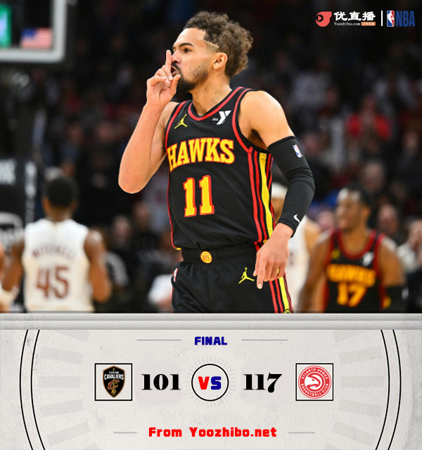 NBA杯,老鹰回到主场再战骑士,前天常规赛两队在克利夫兰有过交手,老鹰11分优势获胜,本场比赛勒韦尔复出。比赛开始,双方迅速进入状态,加兰接连三分助队一波10-2小高潮建立主动权,但老鹰马上回应7-0后,亨特里突外投连续砍分,老鹰接连三分首节反超2分,次节米切尔继续不开和,双方进攻端命中率都不高,亨特接连三分再中,老鹰拉开双位数领先,米切尔和加兰连中4记三分止血,半场骑士继续落后2分。下半场,米切尔还是手感一般,老鹰接连杀内线重新拉开双位数领先,勒韦尔接连三分止颓,但老鹰替补打出12-2攻击波一度拉开20分以上领先,末节双方对攻,加兰带队苦苦追分,但老鹰全民皆兵回应,分差始终保持在十几分,最终老鹰117-101再胜骑士。