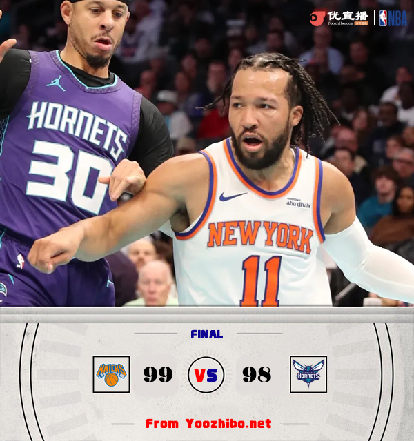 NBA东部NBA杯A组,黄蜂主场迎战尼克斯。拉梅洛-鲍尔和迈尔斯-布里奇斯都不打。一开场,黄蜂率先发力,萨隆高效拿分带队取得领先,次节双方展开对攻,尼克斯火力更猛,唐斯和布伦森联手带队缩小分差,半场战罢尼克斯46-49落后黄蜂。下半场,两队继续缠斗,比分咬得很紧,末节双方争夺陷入白热化,布伦森稳定输出帮助尼克斯取得微弱优势,关键时刻马丁绝平三分不中,黄蜂苦苦追赶无果。最终,尼克斯99-98险胜黄蜂。