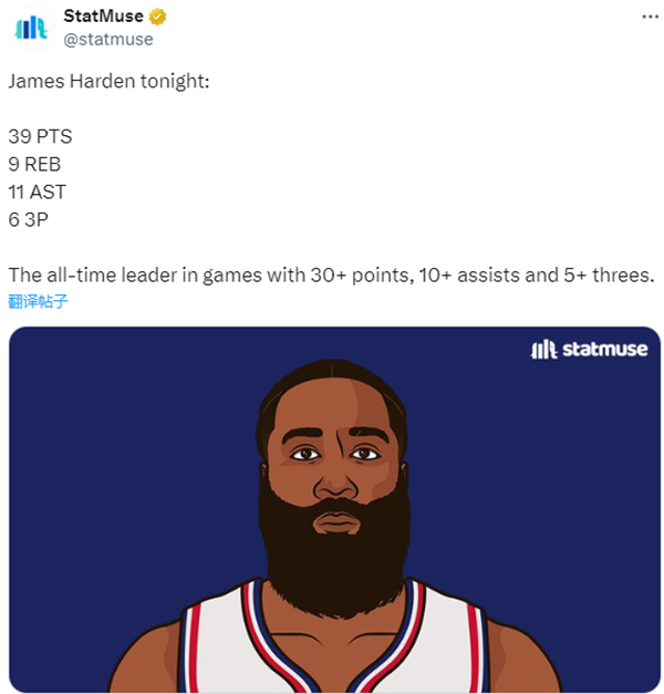 3、哈登成为历史上第一位单场至少30分10助攻且至少命中5记三分的球员