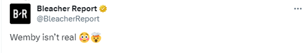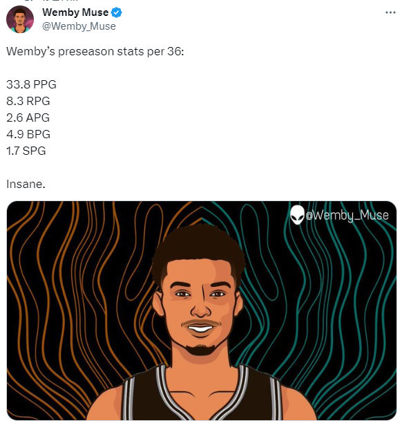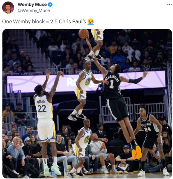 在马刺和勇士的季前赛中,文班亚马单场送出5次盖帽,大帽库里、汤普森以及三次血帽维金斯;尤其是维金斯外线尝试三分,居然也被文班大帽扇飞,这恐怖一幕再次引热议;美媒《露天看台》转发并且配文写道:文班太不真实了。