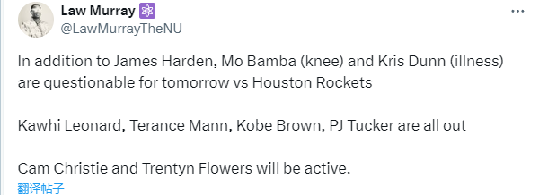 目前快船14胜10负排在西部第六位;根据赛程,明天上午10点快船将在主场迎战火箭;快船记者Law Murray报道,由于右腹股沟酸痛,哈登明日对阵火箭被列为出战成疑(50%出战可能),班巴(膝盖)、邓恩(生病)也出战成疑;小卡、曼恩、布朗和塔克都继续缺席比赛。