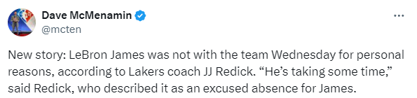 湖人队训练结束后,雷迪克表示:勒布朗现在不在队里,他因个人原因请假了。雷迪克还表示,詹姆斯目前需要一些时间,目前尚不确定詹姆斯是否会在周六对阵森林狼的比赛中复出。