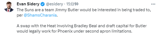 此前shams爆料,热火正在兜售巴特勒,后者想要加盟的球队有勇士、火箭和独行侠;如今shams再次爆料,太阳也是巴特勒的心仪下家。对此,Evan Sidery表示在薪资空间的限制下,太阳用比尔+选秀权资产换巴特勒是合理的。