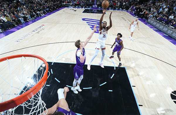 上半场杜兰特8投5中拿到19分6篮板,期间杜兰特想要单臂劈扣却被基昂特-乔治帽掉;布克15投8中拿到22分3助攻,太阳双巨半场合砍41分。