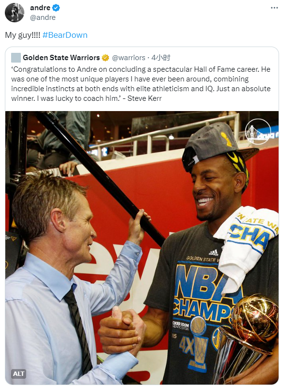 勇士主帅科尔表示:祝贺安德烈结束了辉煌般的名人堂生涯,他是我见过最独特的球员之一,他把攻防两端令人难以置信的本领,和精英级别的运动能力与球商结合到了一起。他是绝对的赢家,我很荣幸能执教过他。