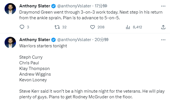 此前,追梦在临时比赛中不幸踩到库明加导致脚踝扭伤,因伤缺席新赛季的全部季前赛;根据赛程,10月25日上午10点,勇士将在揭幕战对阵太阳,格林能否伤愈复出暂未可知。