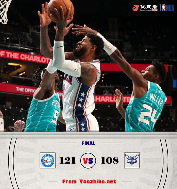 NBA常规赛,黄蜂主场迎战76人,黄蜂目前7胜18负排在东部第13位,而76人则是7胜16负排名东部第12。本场比赛,三球迎来复出。比赛开始,76人反客为主打出7-0开局,黄蜂接连三分回应8-0,但马克西接连中远投再打出8-0,随后乔治接连不讲理三分,首节76人领先8分,次节76人进攻还是靠乔治和马克西撑起,二人连续不讲理三分稳住10分左右领先,但末段三球接连助飞小桥空接暴扣,黄蜂半场追到差5分。下半场,黄蜂开始追分,但76人外线神准总能回应,并重新拉开双位数领先,随后76人替补继续发力拉开20分以上领先,末节黄蜂上来7-0追到差个位数分差,但随后黄蜂没有把握住机会,米勒还崴脚伤退,乌布雷和乔治接连三分,76人一波8-0重新稳住局势,最终76人121-108力克黄蜂。