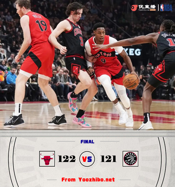 NBA常规赛,公牛对阵猛龙,公牛上场比赛击败黄蜂,猛龙最近遭遇4连败,本场比赛拉文缺阵。开场后猛龙抢占先机,但没有多久武切维奇和怀特就帮助公牛反超比分,随后公牛通过外线三分扩大优势。第二节,巴雷特和迪克轮番冲击内线帮助猛龙追分,不过公牛多点开花牢牢守住优势。易边再战,两队依旧是拉锯战,第三节后半段公牛轮换阵容全面开花将分差拉大到两位数,基迪受伤离场。第四节,猛龙后程发力,依靠迪克和阿巴基一路将比分追上,关键时刻鲍尔命中三分,猛龙始终差一口气。最终公牛122-121送给猛龙5连败。