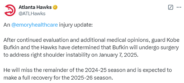 科比·巴夫金,一位拥有无限潜力的年轻后卫,他的新秀赛季原本被寄予厚望。然而,命运似乎对他开了一个玩笑。据老鹰队官方宣布,巴夫金因右肩问题需要进行手术治疗,手术定于2025年1月7日进行。这意味着,他将不得不缺席本赛季剩余的所有比赛,预计要到2025-26赛季开始前才能完全恢复。这无疑是对巴夫金职业生涯的一次重大打击,也让他原本光明的新秀赛季蒙上了一层阴影。