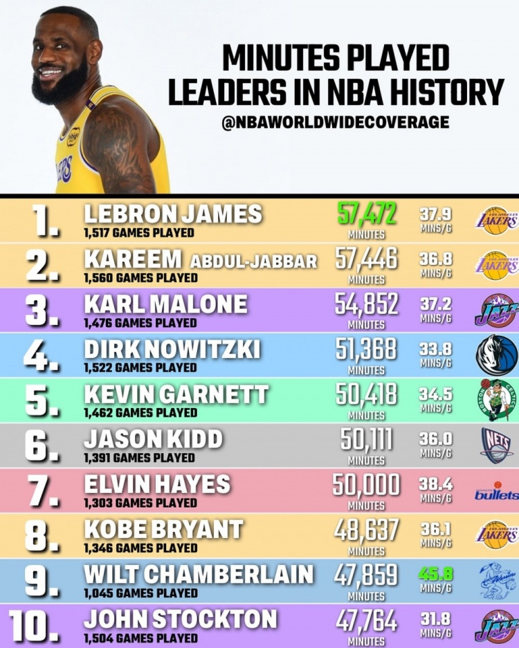 在湖人客场击败国王的比赛中,詹姆斯的常规赛上场时间超越贾巴尔并且升到历史第一位,谈及这样的历史纪录,詹姆斯表示:任何时候我和那些打过篮球比赛的伟大球员联系在一起,都是一种很酷的荣誉。我一直都能够和队友并肩作战。在过去的20多年里,我一直能够在高水平上做到这一点。在我如此热爱的篮球运动中,在世界上最好的联赛中,我能够继续把自己载入史册,这很酷,也让我感觉很谦卑。