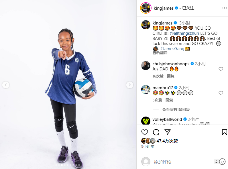 值得一提的是,刚不久,詹姆斯更新Ins祝贺女儿入选学校排球校队,老詹晒出朱莉抱着排球的定妆照,配文写道:加油哇我的女孩,让我们冲哇宝贝,祝你本赛季好运,疯狂呐喊!