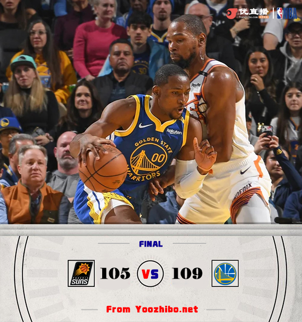 NBA常规赛,勇士主场迎战太阳。勇士3连败目前仅排在西部第十一,太阳西部第十。布克缺阵,库里和追梦迎来复出。比赛开始,比尔手感火热4投全中独得10分,库里和库明加联手带队高效拿分强势反超,杜兰特连续强解拿分,次节勇士连续失误,太阳利用防守反击轰出26-7的进攻狂潮取得两位数领先,追梦连中三分止血,库里压哨命中,半场战罢太阳65-61领先勇士。易边再战,勇士一波7-0的夺回优势,此后双方陷入缠斗,比分交替领先,太阳持续发力占据主动,末节勇士打出10-1反超比分,双方争夺陷入白热化,关键时刻杜兰特和库明加各自两罚全中,太阳连续打铁,勇士罚球杀死比赛。最终,勇士109-105力克太阳,结束了自己的3连败。