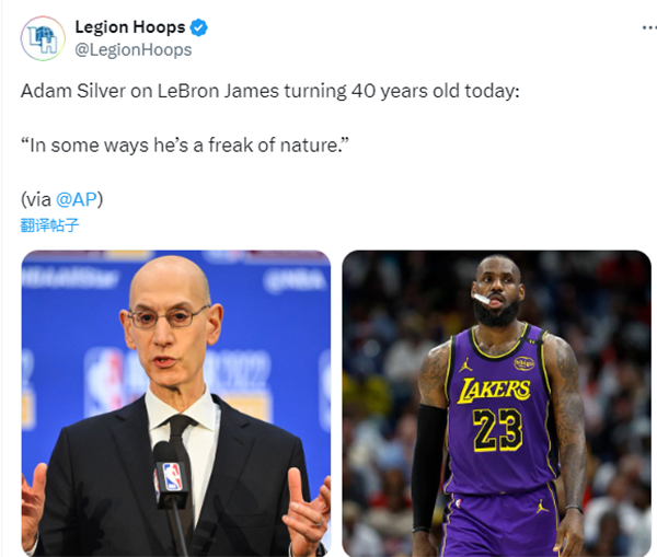 NBA总裁亚当-萧华谈到詹姆斯40岁生日时表示:从某些方面来说,他就是一个自然界的怪人。