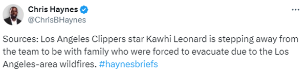 来源:24直播网01-09 10:3424直播网讯北京时间1月9日,据名记Chris Haynes报道,消息人士透露,快船球星莱昂纳德因个人原因暂时离队。据悉,小卡离队的原因是,他要陪伴因在南加州的山火而被迫疏散的家人们。