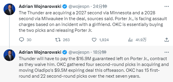火箭把小凯文-波特、2027年二轮签(来自森林狼)和2028年次轮签(来自雄鹿)送到雷霆,得到奥拉迪波和杰雷米-罗宾逊-厄尔