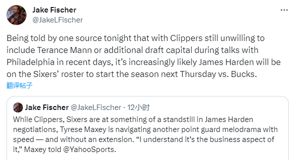 虽然哈登仍旧坚定不移地想要加盟快船,可由于快船在最近几天与76人的谈判中仍然不愿意给曼恩或增加额外的选秀资产,新赛季,哈登很有可能还会留在76人的揭幕战名单上。