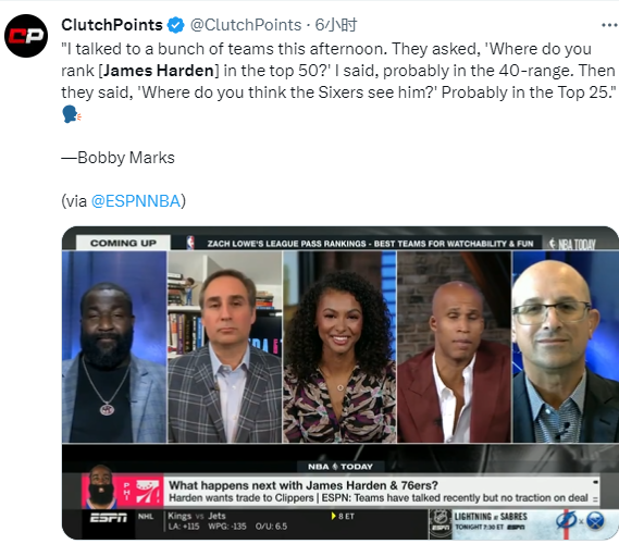 为何76人拒绝降价交易哈登?NBA薪资专家Bobby Marks在节目中表示:就在今天下午,我和几支球队的人聊了这事。他们问我‘你认为哈登现在应该排在联盟第几?’我的答案是大概前40这个范围。”