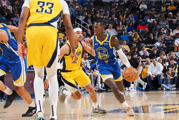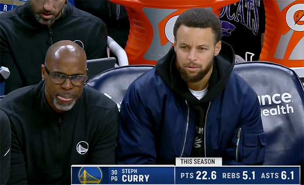 勇士客场背靠背对阵步行者,库里、追梦、维金斯、库明加、佩顿二世和波杰姆斯基都因伤缺席本场比赛,库里身穿便装坐在替补席观战。