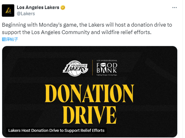 湖人官方声明,球队鼓励本周来观看湖人比赛的球迷募捐,以支持洛杉矶地区的救援工作,所有的捐款及捐赠物品将用于帮助那些受到山火影响的人,募捐活动将在比赛开球前1.5小时开始,直到每场比赛中场休息。